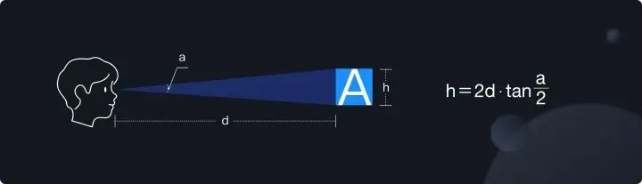什么样的字号,用户看得最舒服?从图中可以看到,在人和屏幕距离一定的时候,人观看文字的视线角度(a),决定了人的舒适程度。有机构和团队做过研究,当大于 0.3 度时的阅读效率是最好的。同时我们在操作电脑时,一般来说眼睛距离电脑屏幕的平均值大概会在 50 厘米(2.45 inch)左右。这就算出来,字体应有的高度大于 12 px,再根据屏幕的 PPI,可以算出字号为 14px 时,77% 的用户最为舒服,而这个字号,就成为 Ant Design 3.0 的主字号。
