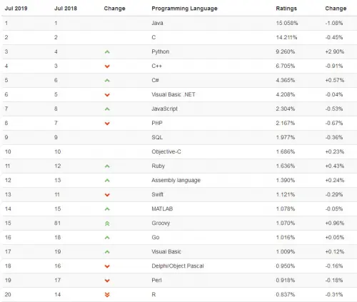 看一下2019年7月份的编程语言TOP20排行榜: