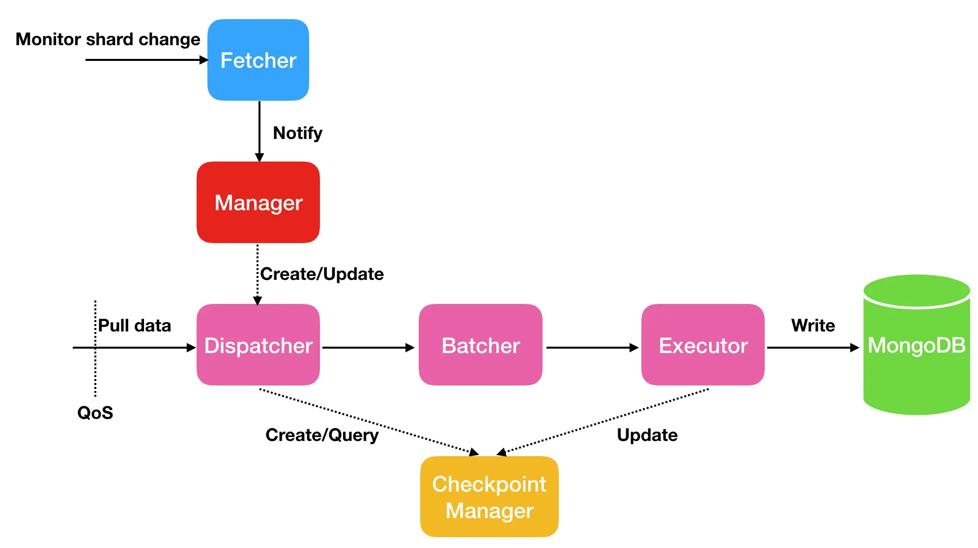 Fetcher线程负责感知stream中shard的变化,Manager负责进行消息的通知,或者创建新的Dispatcher进行消息的处理,一个shard对应一个Dispatcher。Dispatcher从源端拉取增量数据,并通过Batcher进行数据解析和打包整合,然后通过executor进行写入到MongoDB,同时会更新checkpoint。另外,如果是断点续传,那么Dispatcher会从旧的checkpoint位点开始拉取,而不是从头开始拉。