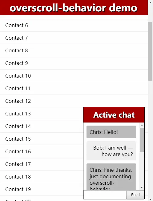 这还是很好做的,我们只要为对话框指定下 overscroll-behavior 属性就可以了,属性置为 contain。