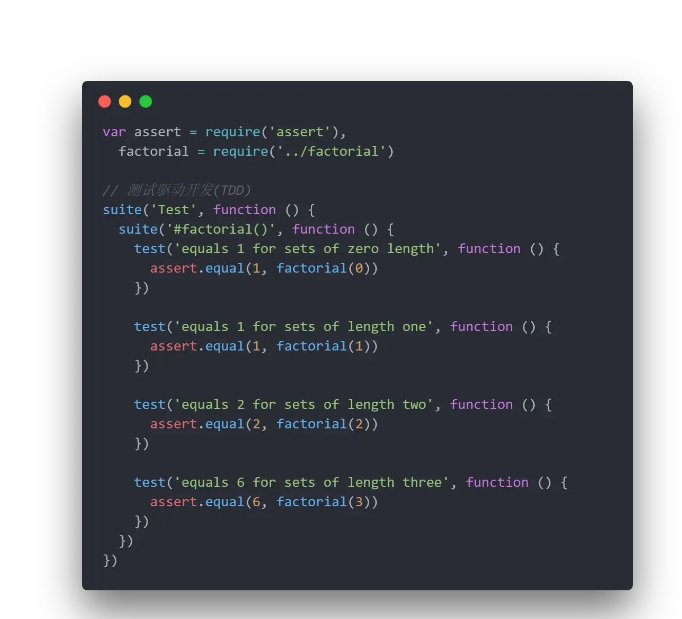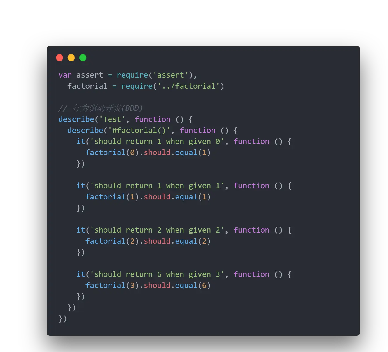 假设我们想写一个计算阶乘的函数,并使用TDD和BDD的方式(基于测试框架Mocha)对其进行测试。