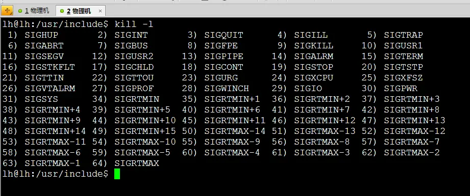 signum:信号的编号,这里可以填数字编号,也可以填信号的宏定义,可以通过命令kill-l("l"为字母)进行相应查看。
