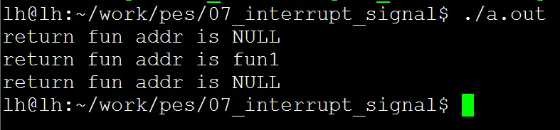 成功:第一次返回NULL,下一次返回此信号上一次注册的信号处理函数的地址。如果需要使用此返回值,必须在前面先声明此函数指针的类型。
