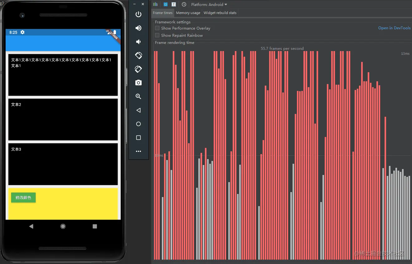每个map里面的属性或者child(children)发生变化都会触发重新build一个widget,component是不变的,由于key的关系,所以会复用之前的widget,不用担心性能消耗。来看下刷新的帧率跟耗时:
