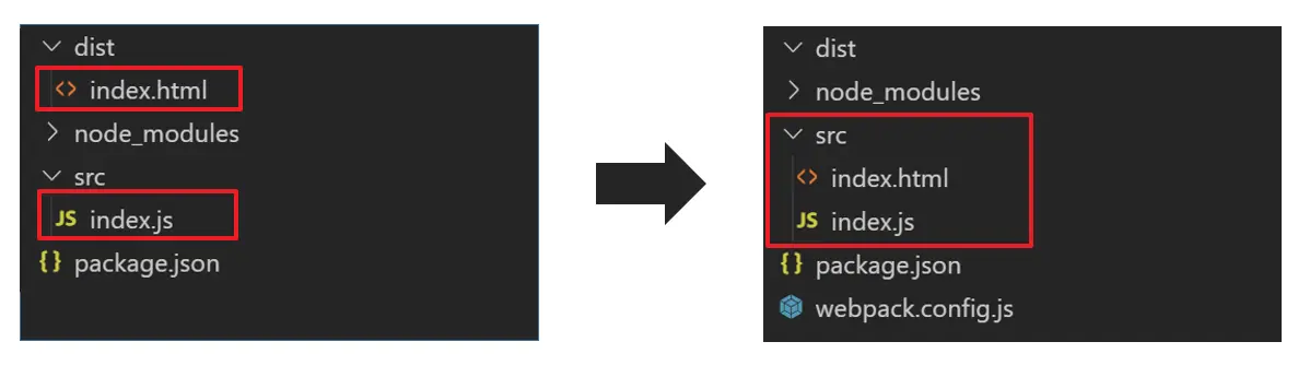 配置HTML模板之前,首先改变一下我们之前的代码目录结构,具体的操作就是将 /dist/index.html 文件,移动到 src 目录下,如下图所示: