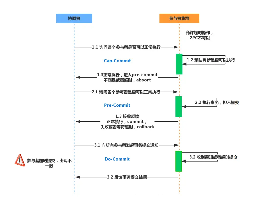 在提交阶段如果发送的是中断事务请求,但是由于网络问题,导致部分参与者没有接到请求,那么参与者会在等待超时之后执行提交事务操作,这样这些由于网络问题导致提交事务的参与者的数据就与接受到中断事务请求的参与者存在数据不一致的问题。