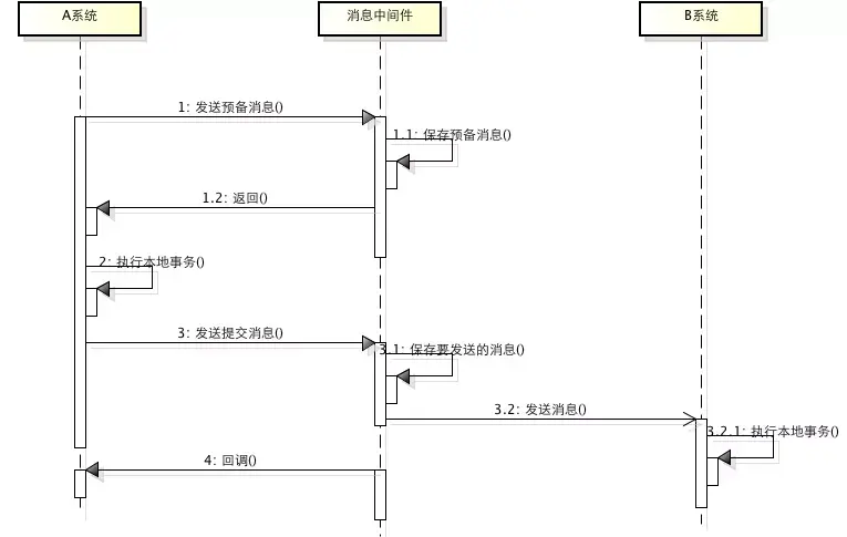 - 如果事务执行失败,则回滚,消息中间件将这条prepare消息删除