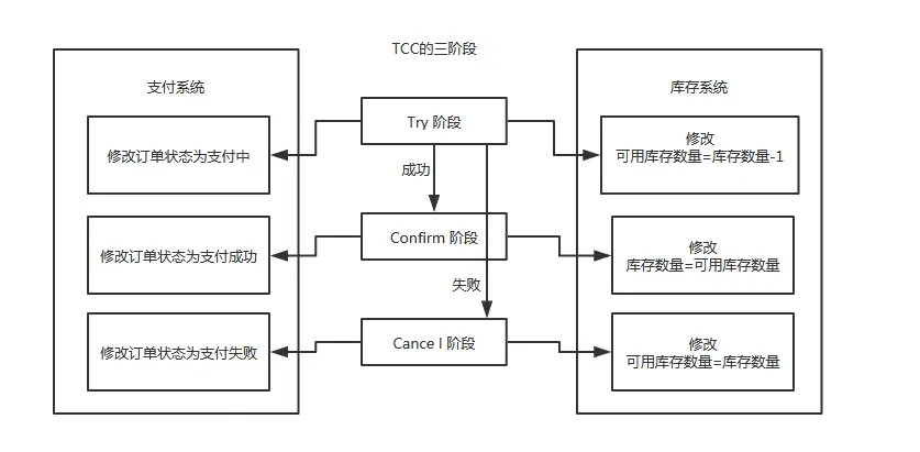 - Try阶段:订单系统将当前订单状态设置为支付中,库存系统校验当前剩余库存数量是否大于1,然后将可用库存数量设置为库存剩余数量-1,