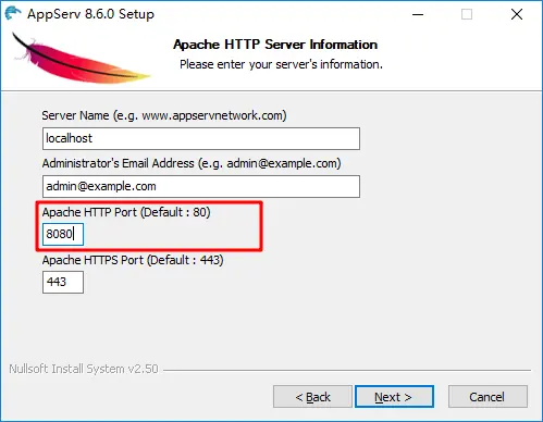 软件下载完成之后,直接双击打开,接下来就是直接回车或者是点击下一步,直到遇到下图。这里我们将红框中的端口号修改一下,不要使用默认的80端口,以免和系统中的其他进程有冲突。一般情况下我们改成8080。