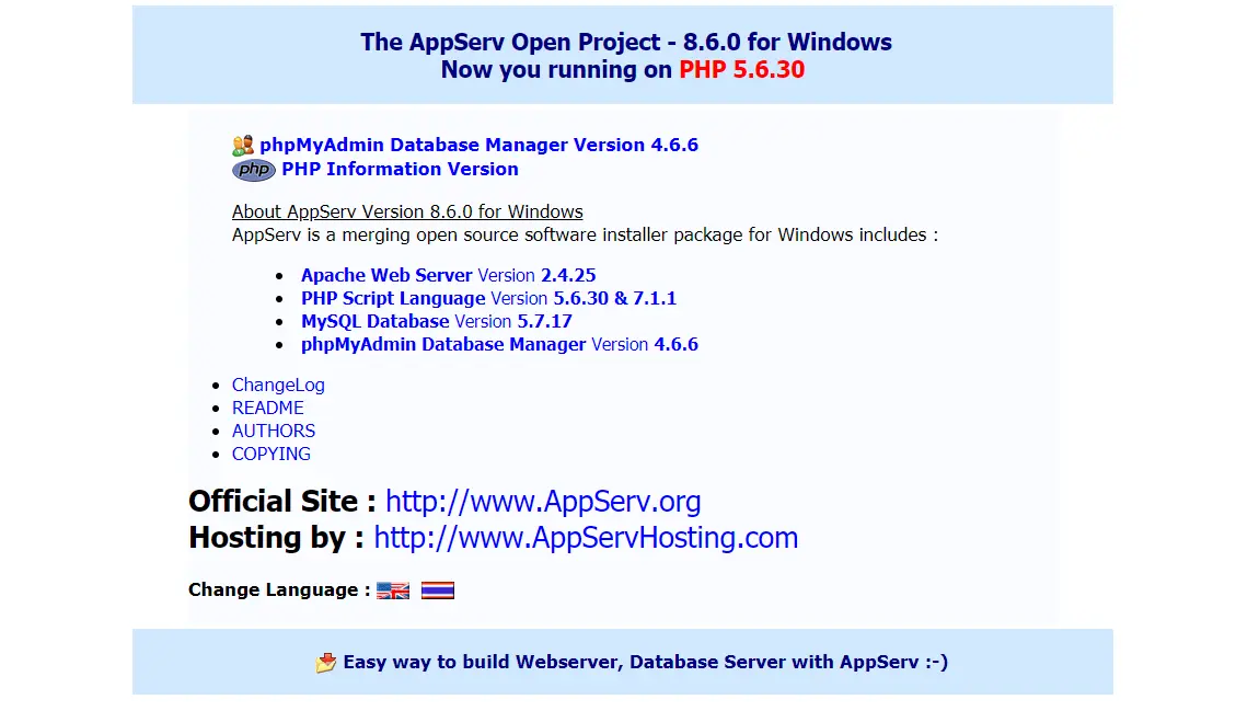 AppServ是一个软件集合,集成了Apache(服务器软件),php(网页程序设计语言),Mysql(数据库系统管理软件),和phpMyAdmin(数据库图形界面管理软件)。使用它能够快速在本地搭建测试服务器,省去了许多烦躁的安装过程。