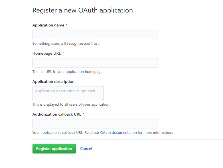 个人的理解是生成这两个东西仅仅是为了辨别要关联的应用,最多再知道生成这个client信息的github账号是什么,当然这一步咱们看不见,最初竟然还在想,那么岂不是需要每个人先在自己github把应用输入一下,然后在进行下一步,后来才明白过来用处是什 么,仅仅是在github填写了一些关于A网站的信息,两者并没有真正的关联