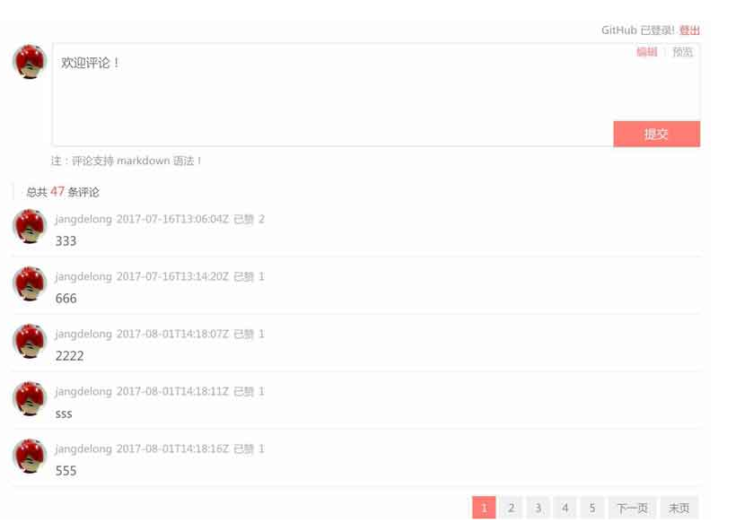 如果user信息可以拿到 那么证明此时当前站点已经与github关联成功 可以拿到访问者的github的一些信息 包括头像 名称,以及个人网站等,利用这些信息就可以发表评论,将评论内容插入数据库,并进行评论列表渲染等一系列操作。