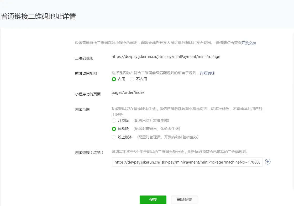 1、在整个开发工程中,小程序后台管理配置的测试链接必须和生成二维码的链接保持一致,否则会自动跳转至正式环境,但是在后台管理配置说明规则中则是保持二维码规则,但是真实使用中必须保持链接一致。