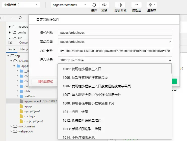 开发工具中模拟扫描二维码打开小程序需要配置相关数据。如图所示: