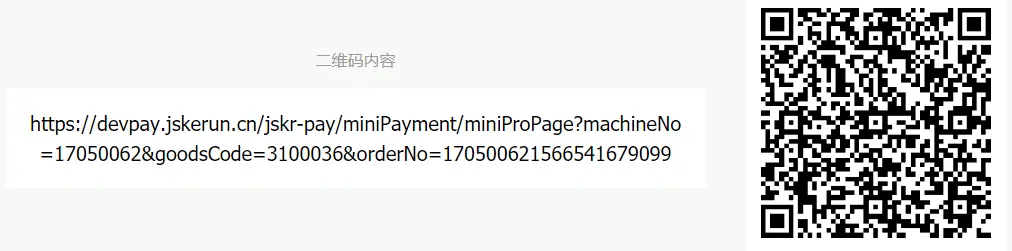 options.q=https://devpay.jskerun.cn/jskr-pay/miniPayment/miniProPage?machineNo=17050062&goodsCode=3100036&orderNo=170500621566541679099
