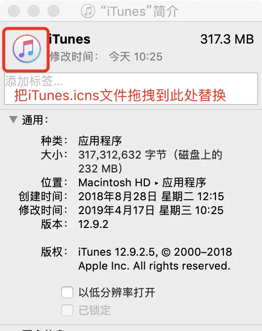 - 「访达」—「应用程序」—「iTunes.app」显示简介,拖拽iTunes.icns文件至简介顶部iTunes图标除替换即可。