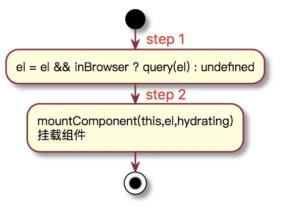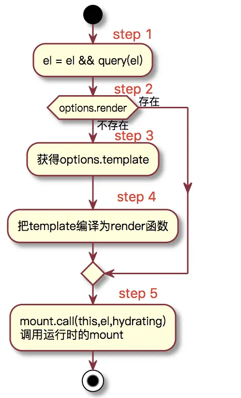 $mount的el既可以是string,也可以是Element,通过query(el)把el都转为Element - step2:判断render函数是否存在,若存在直接跳转到 step5