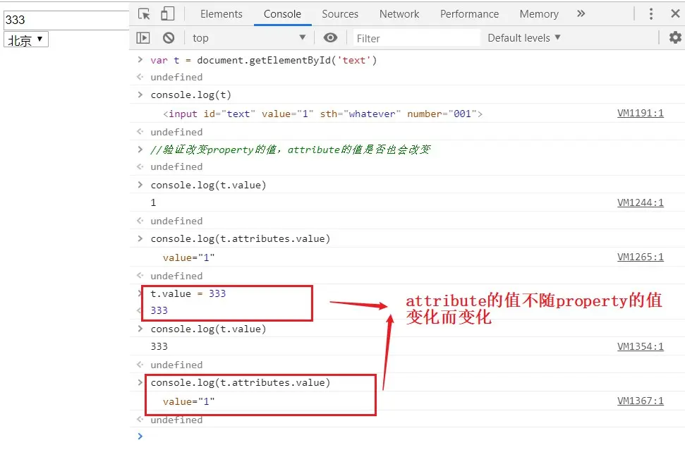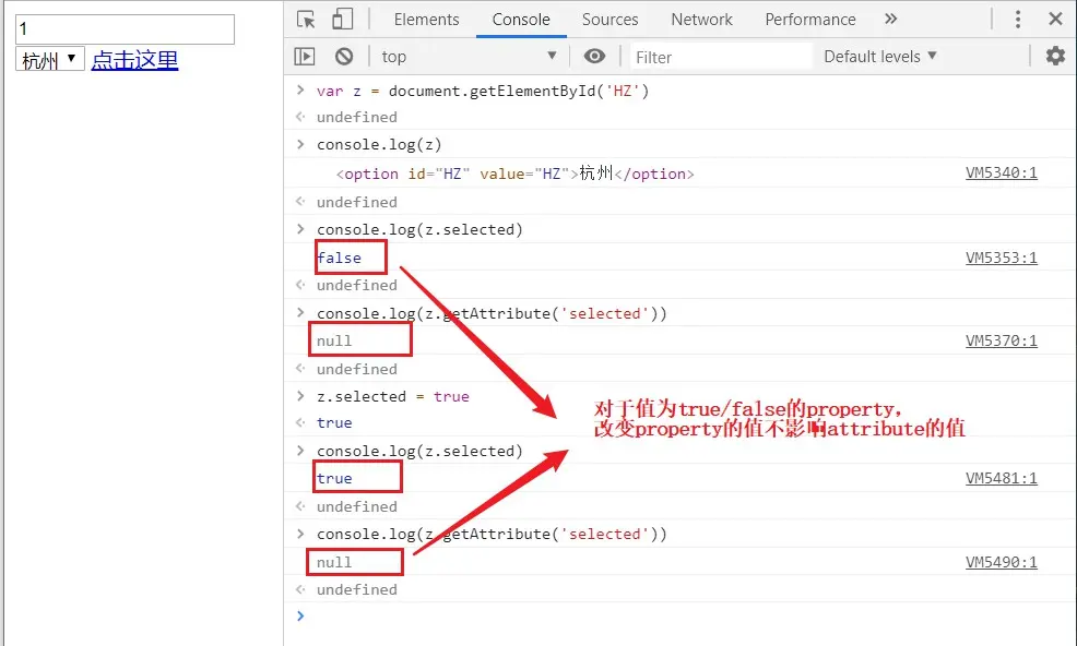对于值是true/false的property,attribute取得值是HTML文档字面量值,property是取得计算结果,property改变并不影响attribute字面量,但attribute改变会影响property计算。