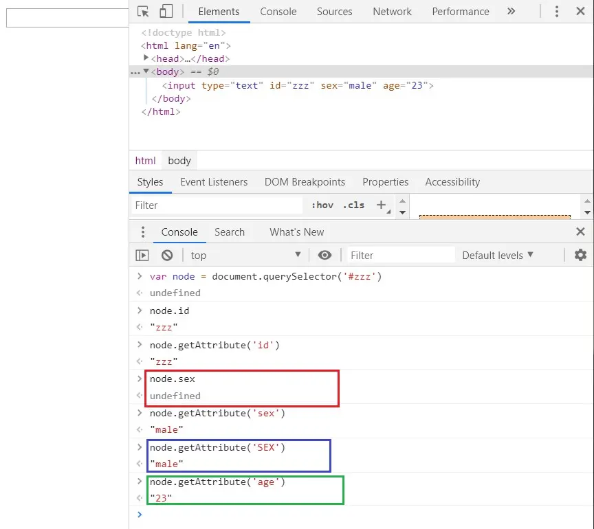 - node.property的方式不能获取自定义属性,node.getAttribute()的方式可以获取自定义属性。