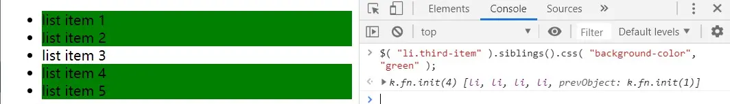 $( "li.third-item" ).siblings().css( "background-color", "green" );