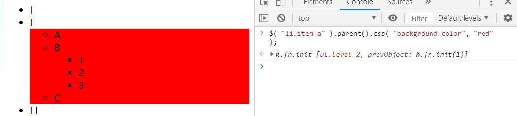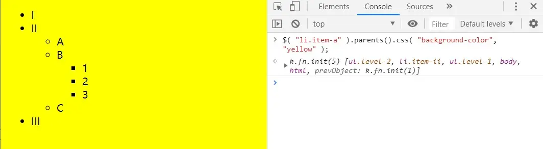 $( "li.item-a" ).parents().css( "background-color", "yellow" );