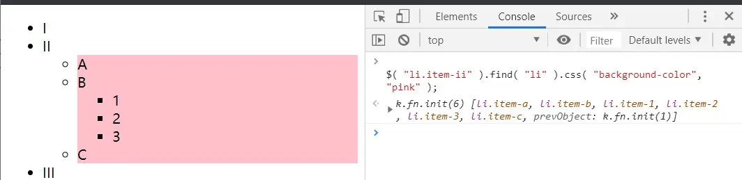 $( "li.item-ii" ).find( "li" ).css( "background-color", "pink" );