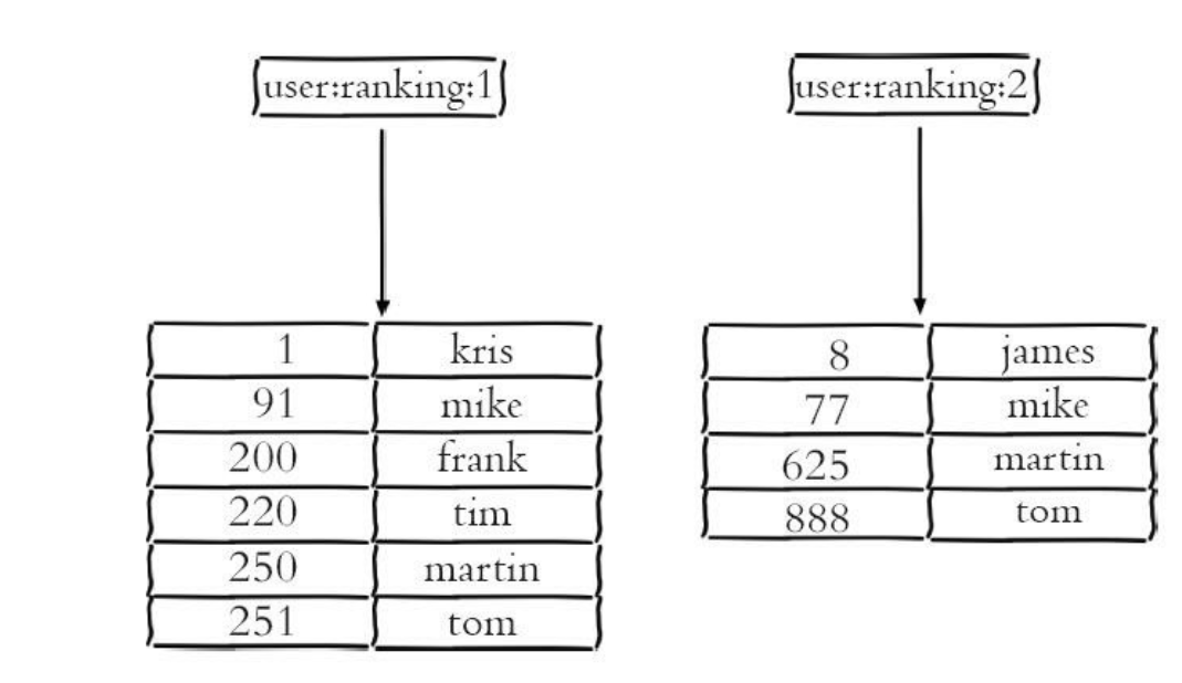 127.0.0.1:6379> zadd user:ranking 1 kris 91 mike 200 frank 220 tim 250 martin