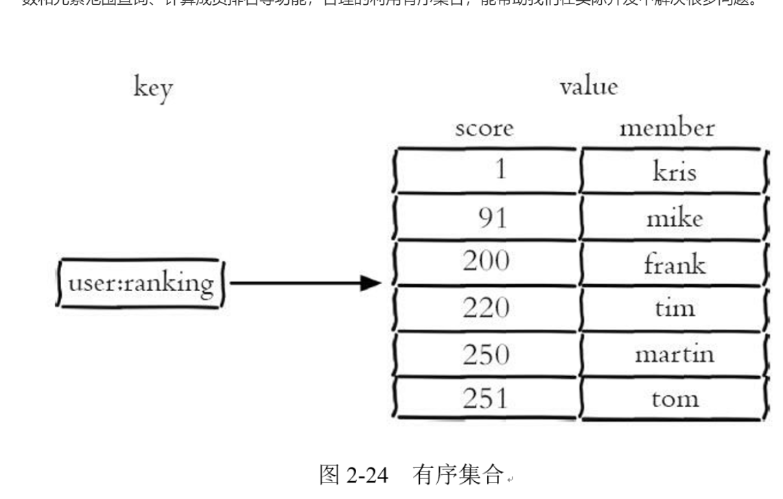 有序集合相对于哈希、列表、集合来说会有一点点陌生,但既然叫有序集合,那么它和集合必然有着联系,它保留了集合不能有重复成员的特性,但不同的是,有序集合中的元素可以排序。但是它和列表使用索引下标作为排序依据不同的是,它给每个元素设置一个分数(score)作为排序的依据。如图2-24所示,该有序集合包含kris、mike、frank、tim、martin、tom,它们的分数分别1、91、200、220、250、251,有序集合提供了获取指定分数和元素范围查询、计算成员排名等功能,合理的利用有序集合,能帮助我们在实际开发中解决很多问题。