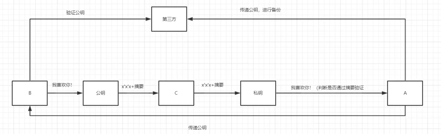而在互联网中,我们可以借助第三方公证处的力量,A在生成公钥以后,不仅仅给B一份,还在第三方进行一次认证,把这个公钥给第三方,B拿到A传递过来的公钥以后去第三方验证一下,那么不就OK了吗?