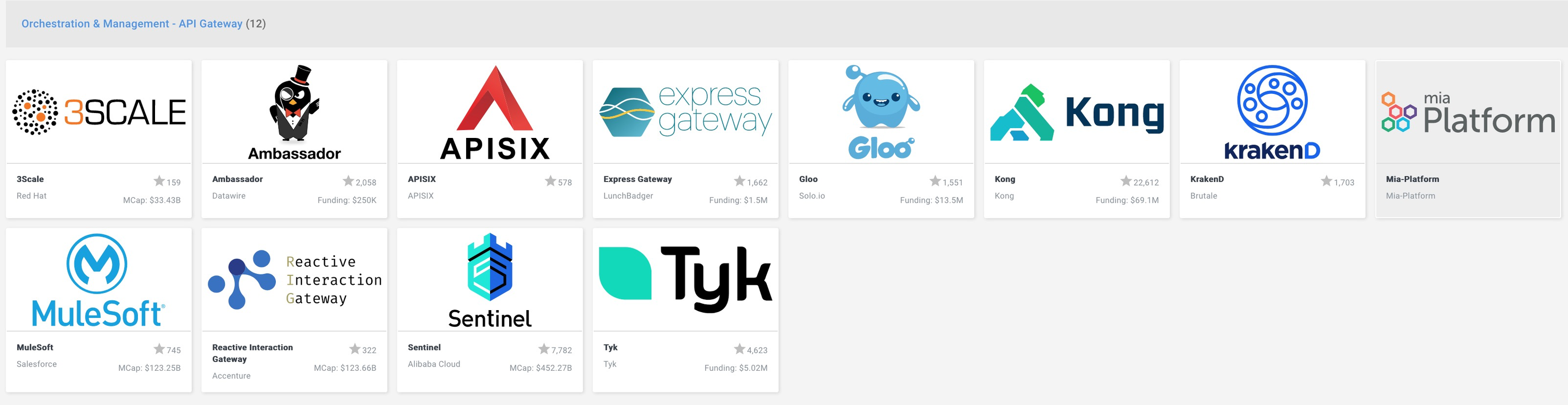 所以我们更偏重于开源的 API 网关方案,比如 Kong、APISIX 和 Trk 等。这些 API 网关是从云原生软件基金会(CNCF)的[全景图]中摘选的: