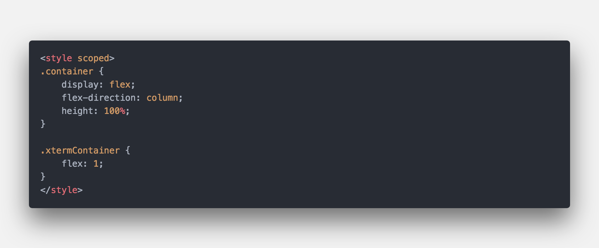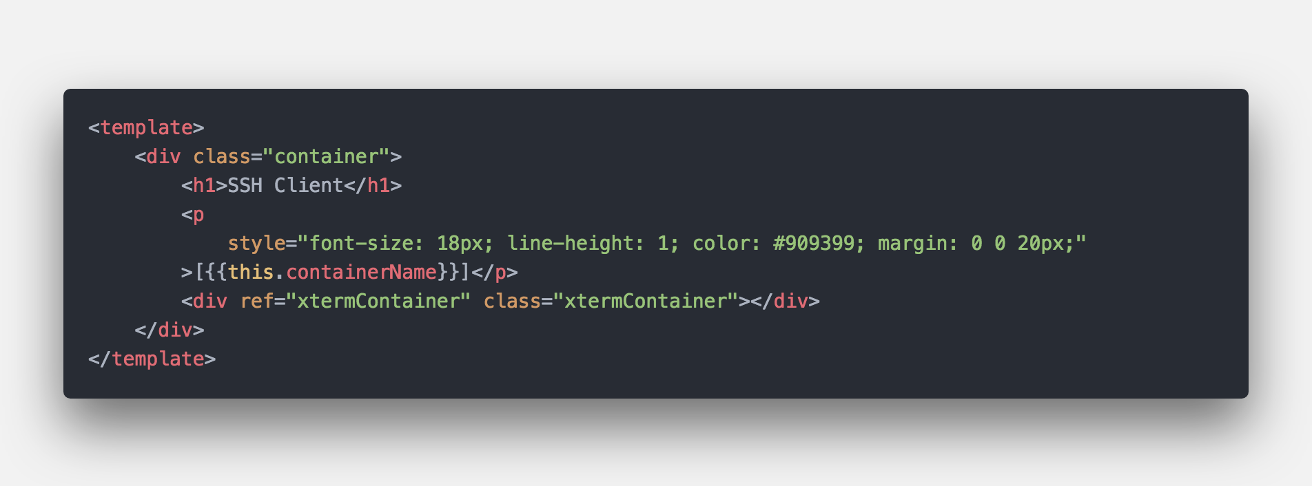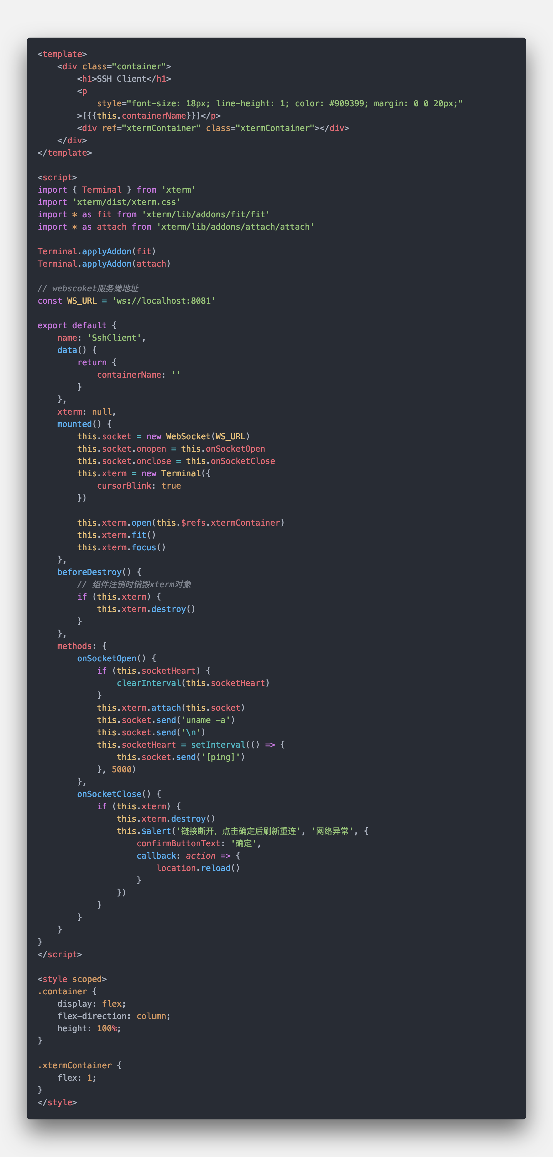 首先是vue的template块和style块,超级简单的 页面标题,副标题(显示目标服务器名称), 还有一个终端容器。