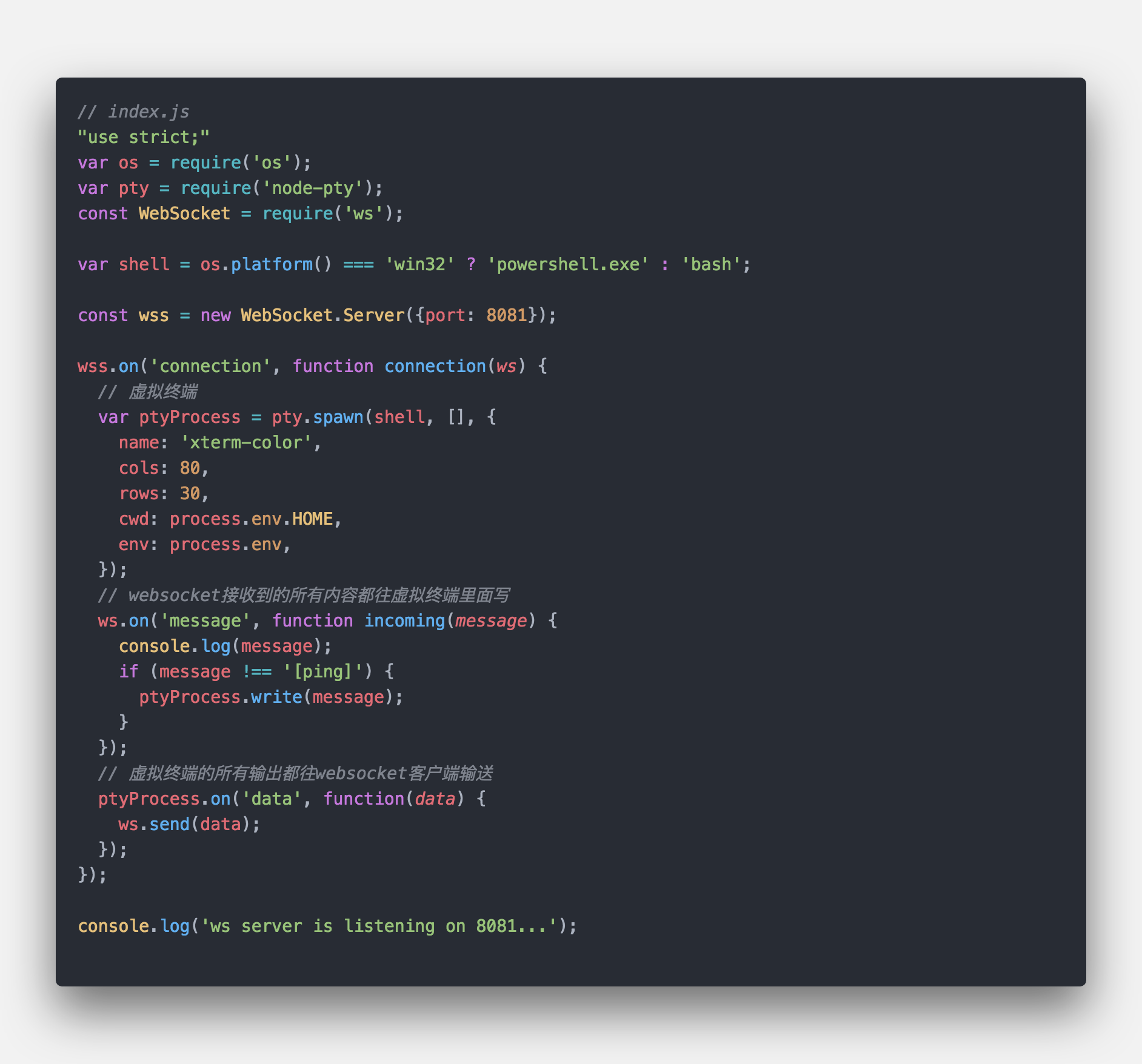 在使用扩展连接服务器之前,我们这里先准备一个demo服务,新建一个websocket的demo项目,安装node-pty模块和ws模块, 代码如下: