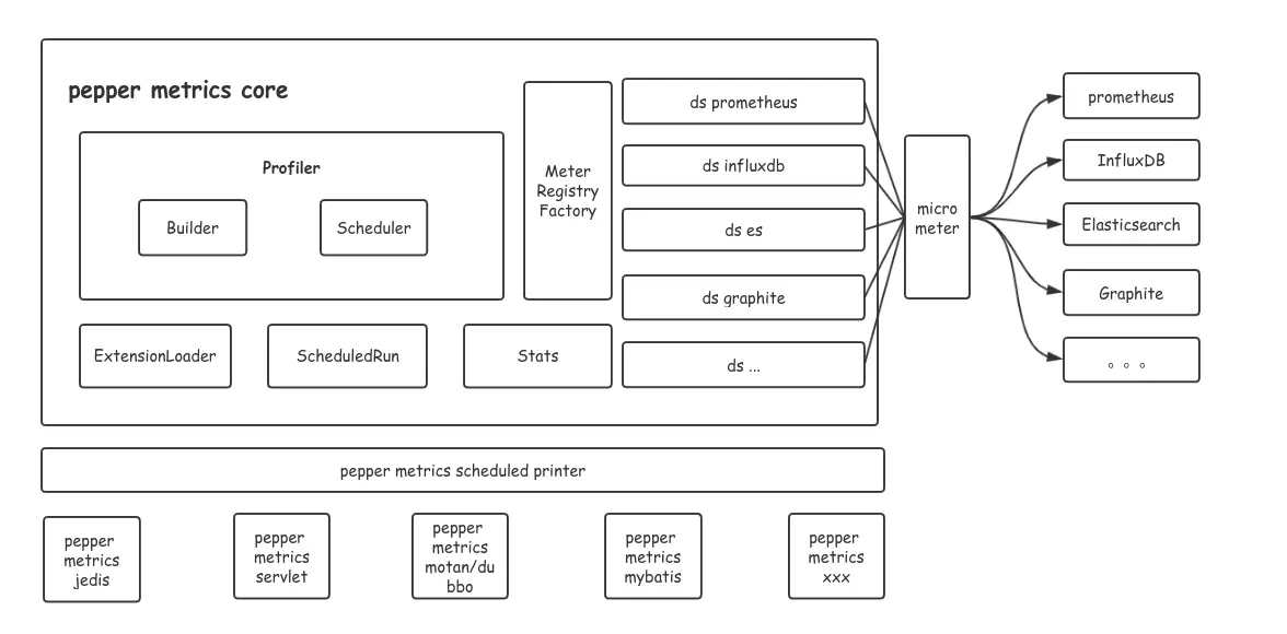 上面简述了Pepper Metrics项目的核心思想及方法论依据,而从技术上来说,Pepper Metrics项目构建了一套完整的可插拔插件体系,使应用可以基于选用的组件(如RPC通信框架dubbo,motan、ORM对象模型关系映射框架mybatis、标准的HTTP Servlet组件、Redis操作库jedis、等)选择现有的插件扩展直接具备上述指标的: