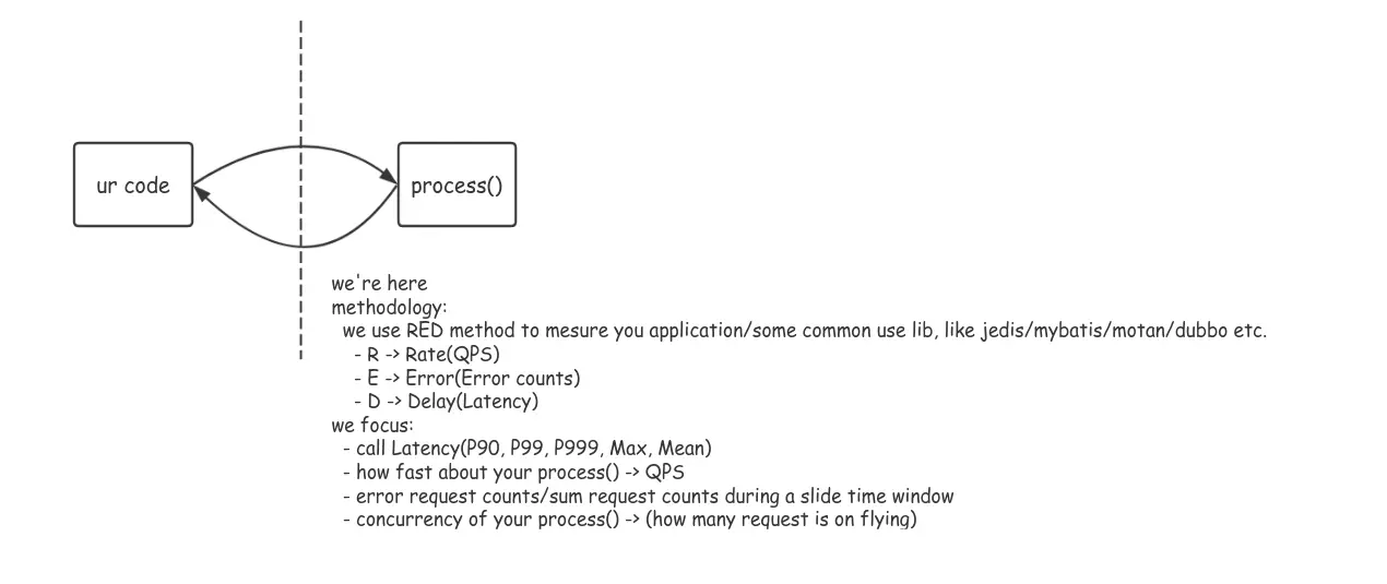 Pepper Metrics项目从核心上来说,基于Tom Wilkie的RED理论,即对每个服务 (这里的服务特指进程中的某种调用,比如调用一次数据库查询)进行RED指标收集,包括: