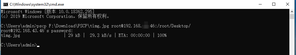 输入命令pscp F:\Download\PSCP\timg.jpg root@192.168.XX.46:/root/Desktop/