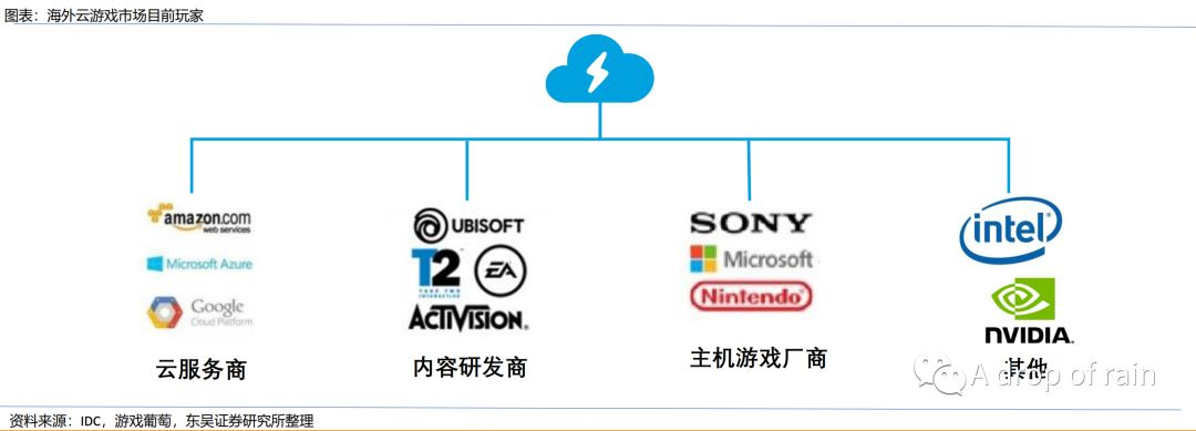 从企业布局来看,游戏行业从游戏平台企业到游戏发行商、制造商、硬件厂商,甚至云服务公司,都参与到云服务中。包括暴雪、EA、任天堂、索尼、谷歌、微软、阿里、腾讯、华为、网易、NVIDIA、AMD等,在发展初期,云游戏行业格局呈现“百家争鸣”之态。