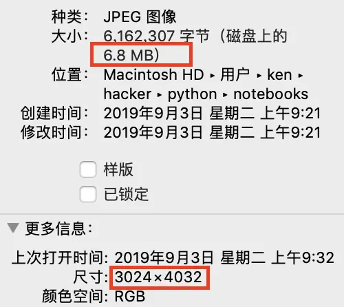 可能大家觉得这张图片还不算大。我测算,用自己的 iPhone 8 Plus 正常拍摄一张手机照片,它的大小是 3024 × 4032 ,这样一张图片在未压缩的情况下,所占用的存储空间大小是 3024 × 4032 × 3 = 35 MB 。而实际,如下图,在我的 Mac 上看到的图片, 只有 6.8 M ,也就是说,我们在使用手机拍摄照片后,在保存在相册之前,相机程序已经自动对我们拍摄的照片照片进行了压缩,这里的压缩比是 35 / 6.8 = 5,压缩比并不是一个固定值,也就是说同样大小的不同照片,在经过相同的压缩处理后,占用磁盘的空间也是不一样的。