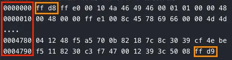 我们注意到用橙色线框框着的两个部分,ff d8 表示图片数据开始,英文缩写 SOI (Start Of Image),ff d9 表示图片数据的结尾,英文缩写 EOI (End Of Image)。