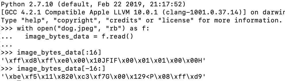 在一台已经安装了Python(MacOS 内置了 Python 2)机器,启动命令行,输入 python 进入 python 交互式编辑环境。使用如下 python 代码,查看 图片 dog.jpeg 的二进制字节流。