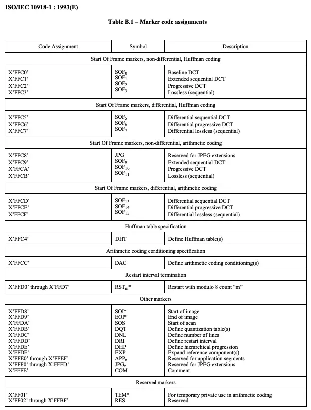 下图为 国际电信联盟 (INTERNATIONAL TELECOMMUNICATION UNION) 发布的静态图像数字压缩和编码规范中,关于标记码的分配表,也是本文解析图片标记数据,的参考依据。感兴趣,可以通过此表,了解到本文未详尽的内容,如关于标记数据的描述说明。