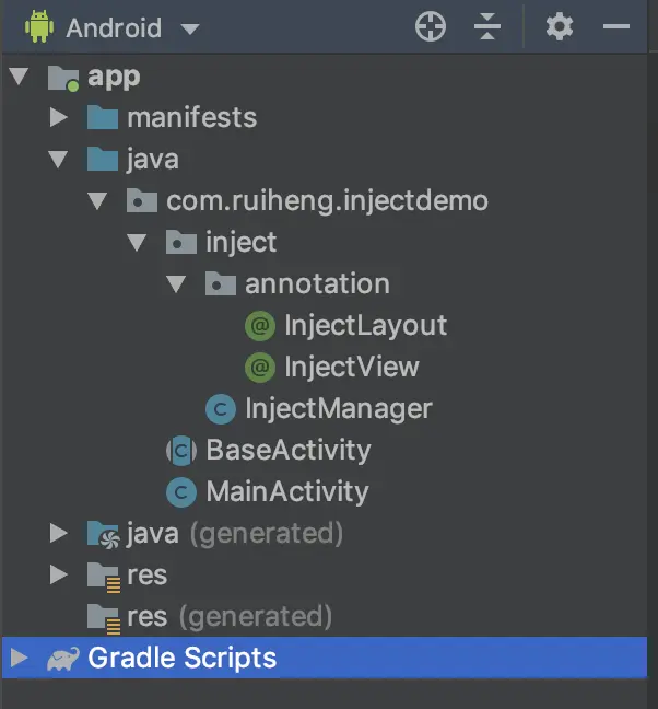 inject目录下包含有一个annotation文件夹和一个InjectManager类 annotation目录存放自定的注解,InjectManager实现具体的功能
