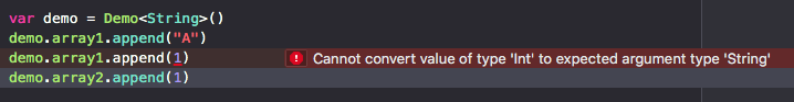 这个结构体被声明为泛型,成员 array1 要求泛型,array2 要求为 Any,使用时,我们就能看出差别: