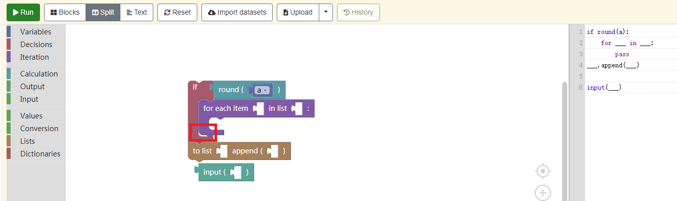 blockpy是面向高年龄向青少年的针对性很强的学习系统,不再主打对界面的呈现效果,预览到的运行结果也全变成了console的打印结果。组件部分有诸如variable、input、value这种python的专业组件,界面的整体风格也更加严肃,同样有组件转代码预览的功能。除此之外他还具有ivx这种商业可视化开发工具都不具备的大数据导入功能,这已经将学习的内容与前沿技术联系了起来,其界面如下图: