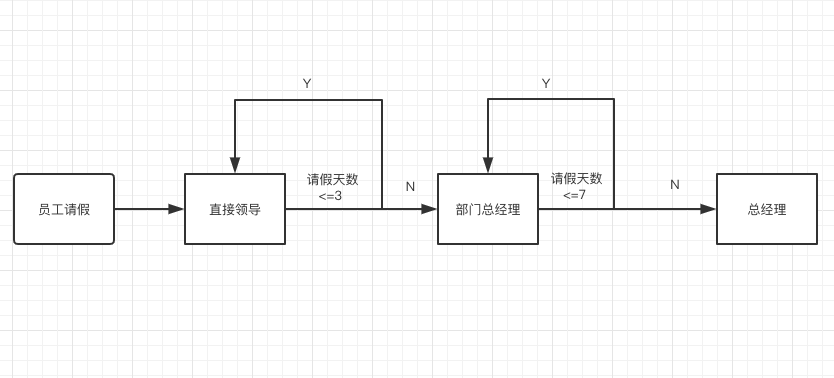 我们来模拟一个公司的请假流程,比如说,在公司中,我们平时请假,在 OA 上面发起申请流程,少于 3 天的一般由组长审批即可,大于 3 天的小于 7 天的由部门总经理审批,大于七天的由公司总经理审批。