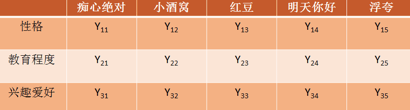 矩阵A=矩阵X和矩阵Y的转秩的乘积x的列表示和Y的横表示可以称之为ALS中的因子,这个因子是有隐含定义的,这里假设有3个因子,分别是性格、教育程度、爱好。A矩阵经过ALS分解出的X、Y矩阵可以分别表示成: