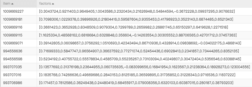 本案例中会输出2张表,对应ALS算法介绍中说的X矩阵和Y矩阵。
