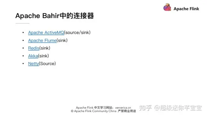 Apache Bahir 最初是从 Apache Spark 中独立出来项目提供,以提供不限于 Spark 相关的扩展/插件、连接器和其他可插入组件的实现。通过提供多样化的流连接器(streaming connectors)和 SQL 数据源扩展分析平台的覆盖面。如有需要写到 flume、redis 的需求的话,可以使用该项目提供的 connector。