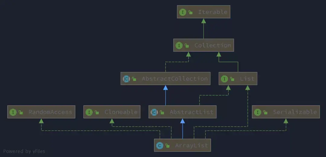 从上图可以看出 ArrayList 继承了 AbstractList, 直接实现了 Cloneable, Serializable,RandomAccess 类型标志接口。