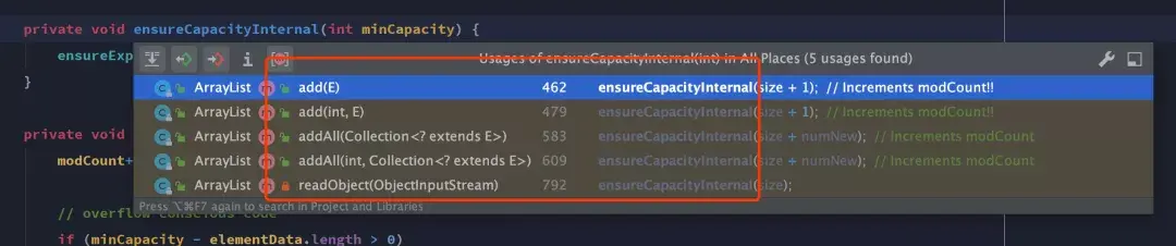 到这里 java.util.ArrayList#add(E) 方法的扩容逻辑就分析结束了。类似的,在其他添加元素的方法里实现内我们都可以看到 ensureCapacityInternal 方法的调用,在真正操作底层数组前都会进行容量的确认,容量不够则进行动态扩容。