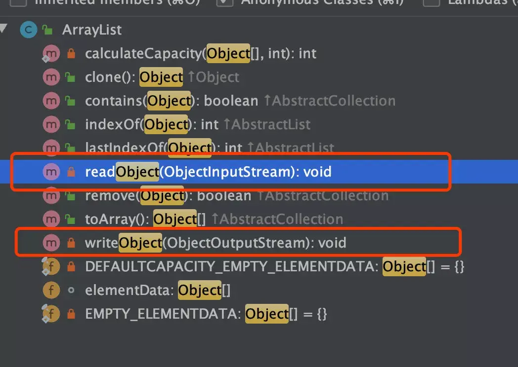 进入 ArrayList 源代码,从类的结构里很快就能看到 ArrayList 的两个重要成员变量:elementData 和 size。